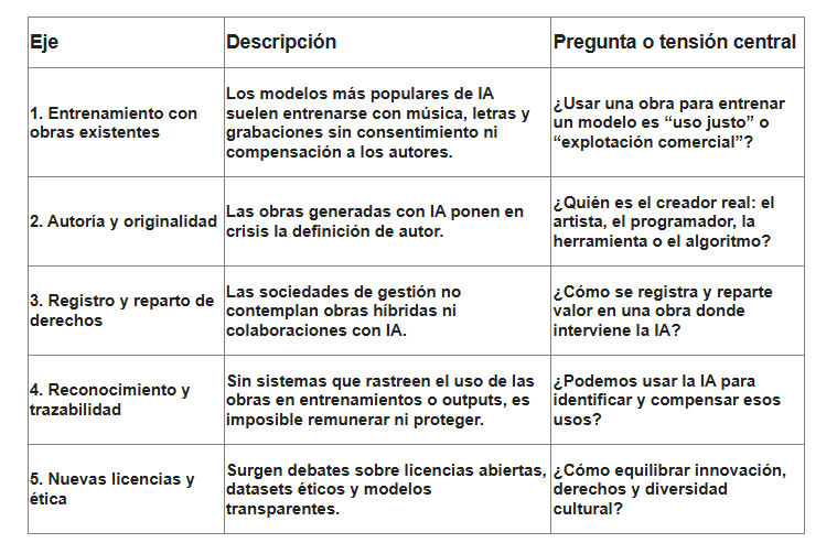 ¿SADAIC tiene las herramientas para liderar o poder dar una propuesta o discusión para la transformación? Podría invertir en innovación, transparencia y formación a los autores, a sus socios y representados y al ecosistema en general, idealmente junto a otras sociedades autorales locales con similares problemáticas. Podría generar foros, seminarios, espacios de debate. Podría invertir en desarrollos o aliarse con proyectos que ya lo están haciendo. Mientras tanto, afuera… Mientras acá seguimos discutiendo si una obra con IA debería cobrar menos, En la Argentina, que conozca, aparecen propuestas de carácter declarativo como JUSTICIA, que creo es un proyecto que puede tener potencial si buscan ser un espacio de debate y pensamiento crítico por sobre los dueños de una nueva verdad. Una de las grandes paradojas de este momento es que la principal manera de enfrentar a la tecnología es apropiandonos (crítica y creativamente) de esa misma tecnología. Los desafíos generales Me parece importante destacar cuales son los principales desafíos que aparecen a la hora de entender la música y la inteligencia artificial generativa. |