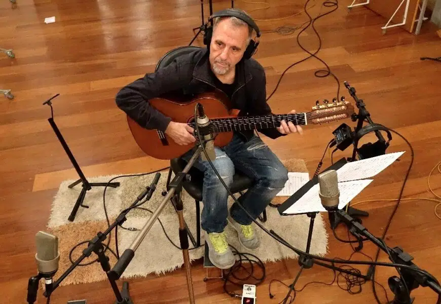 La guitarra de siete cuerdas aparece cuando en los 70s yo estudiaba guitarra clásica. En aquel entonces no había para estudiar guitarra en la universidad, sólo instrumentos sinfónicos. Había un prejuicio muy grande con la guitarra, como en varias partes del mundo, era un instrumento popular, para pobres. Entonces fui al conservatorio y a estudiar con un vecino de mi abuelo que enseñaba guitarra clásica. A su vez, yo sacaba todas las canciones de música. A mediados de los 70s, hubo aquí en Brasil un “revival” del “shoro”, una música urbana instrumental muy rica que se toca con mandolina y, precisamente, guitarra de siete cuerdas y ahí quedé enamorado. Comenzamos a hacer conciertos con las viejas eminencias del shoro y comencé a entender el lenguaje de el instrumento que también se usa en el samba. Al tener una cuerda más grave, hace unos contrapuntos increíbles en los graves con la melodía, una cosa muy rica, interesante y de mucha improvisación. Luego seguí como solista de siete cuerdas con cuerdas de nylon, aunque originalmente las cuerdas son de acero. Me enamoré completamente de este instrumento que es muy de aquí, pero a la vez es universal; se pueden tocar muchas cosas.